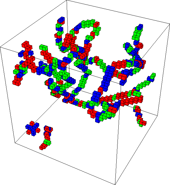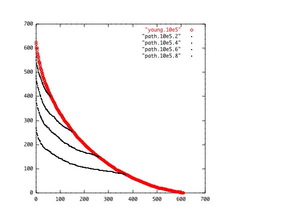 Here is a picture of elements of a random permutation flowing through a Young diagram under the Robinson-Shensted-Knuth process. (It's oriented so that the top row of the Young diagram is at the left.) I would love to have a hydrodynamic description of these flows...